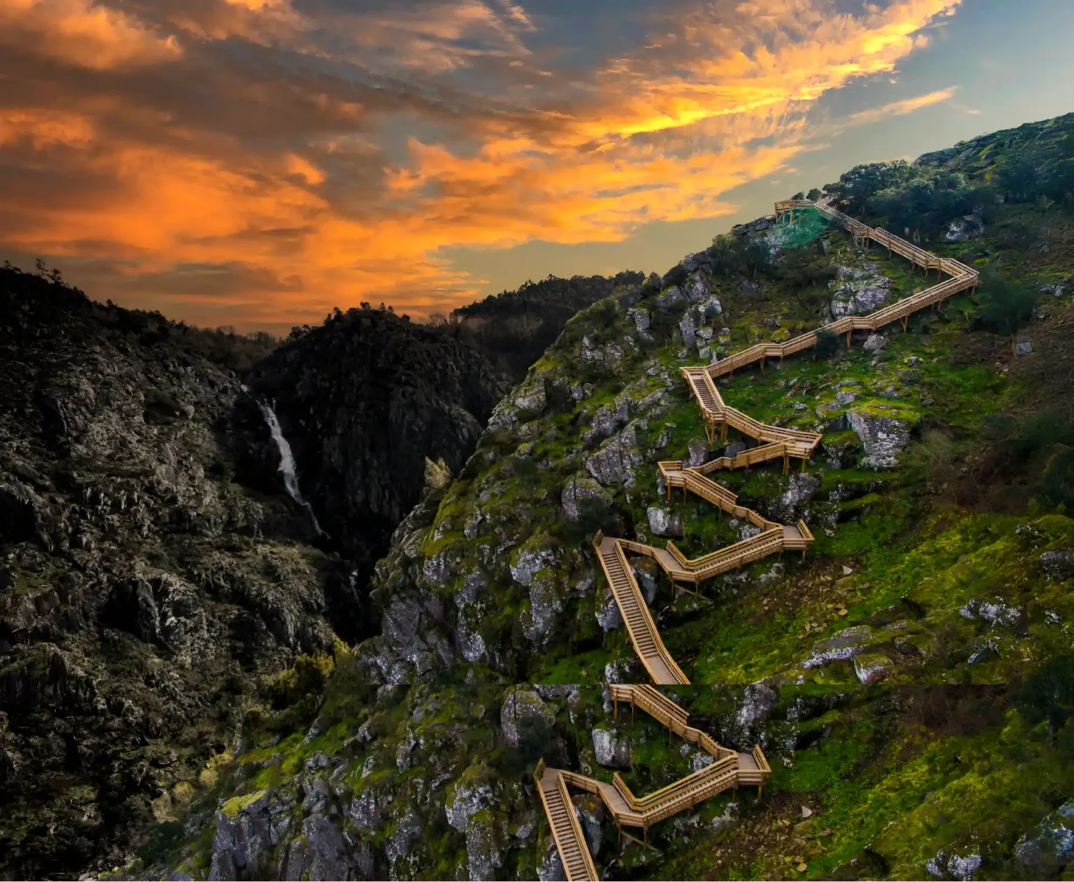Percurso pedonal de 8,7 km em madeira tratada, integrado na paisagem natural do Arouca Geoparque.