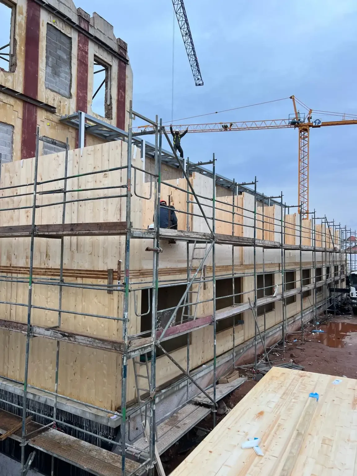 O processo construtivo revela também a integração cuidada entre a nova estrutura em madeira e o edificado pré-existente, assegurando compatibilidade estrutural e respeito pelo contexto urbano envolvente. A progressão em altura, acompanhada por andaimes perimetrais, garante uma execução segura, rigorosa e eficiente.